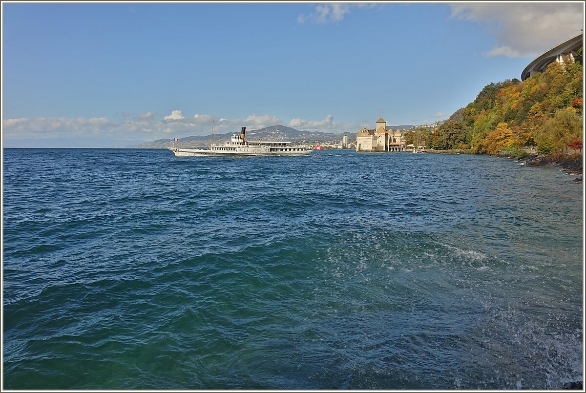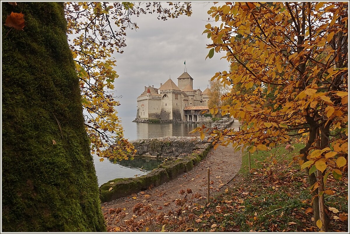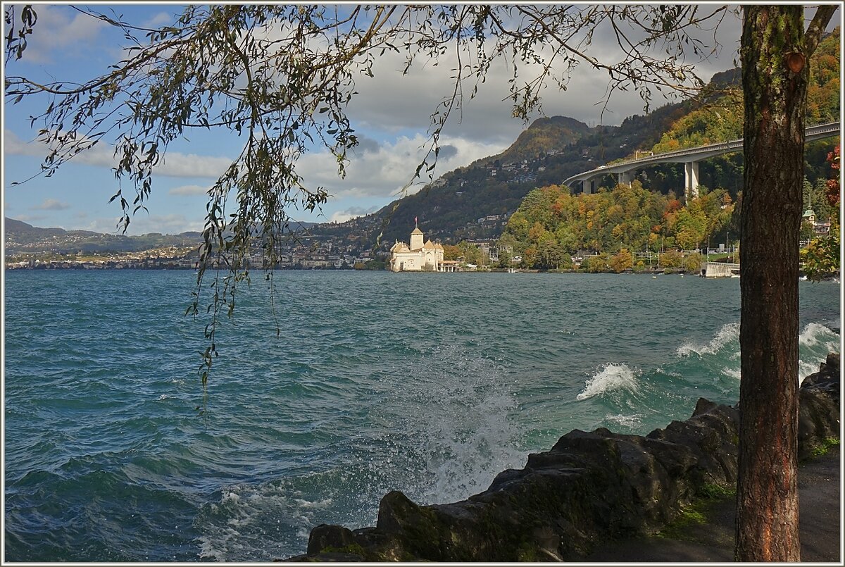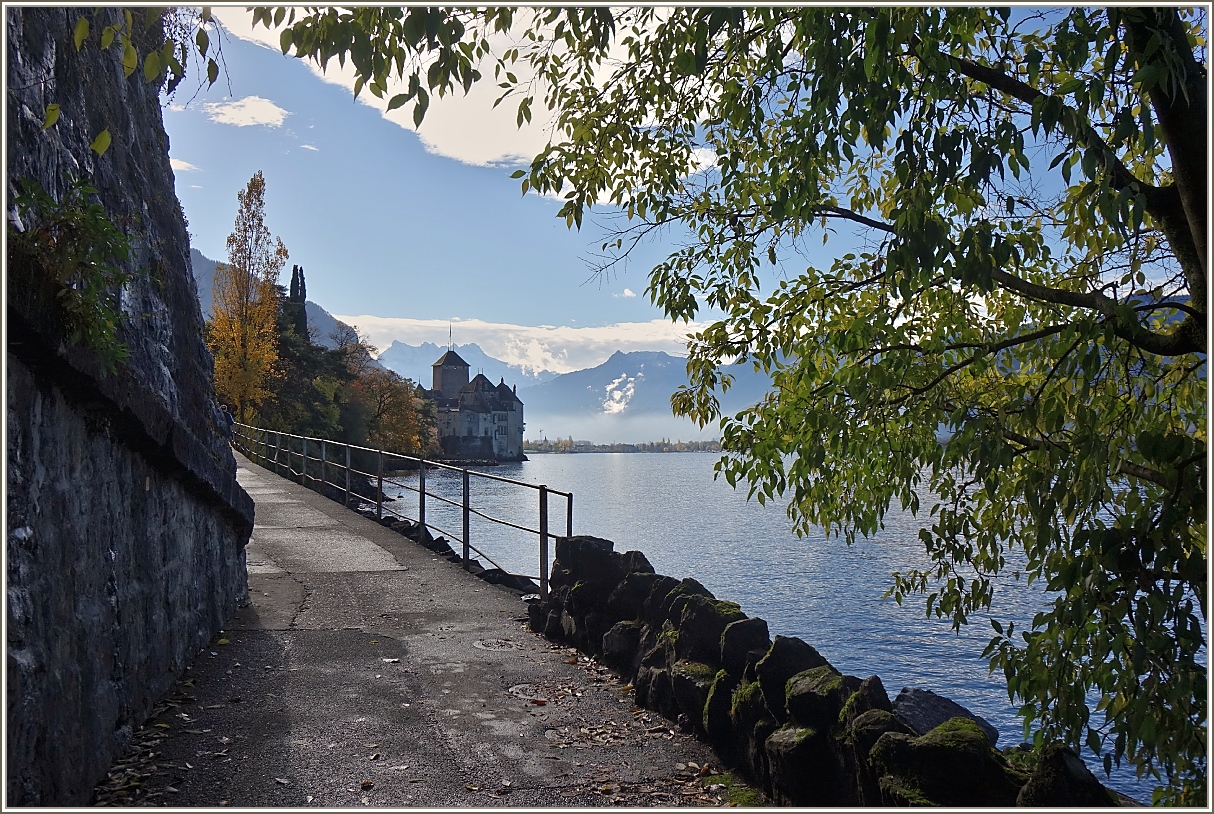 Das Château de Chillon und der tiefverschneite Dents-de-Midi.